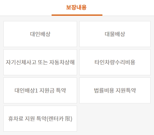 - 타인차량수리비용 - 피보험자동차를 운전하는 동안 다른자동차와의 충돌 또는 접촉으로 발생한 피보험자동차의 손해를 보상 (자기부담금 50만원)