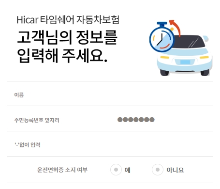 보험가입을 위해서는 이름, 주민등록번호 앞자리, 휴대폰번호를 입력하고 운전면허증 소지여부를 확인해야 합니다. 보험계약 취소 및 해지를 위해서는 이름, 주민등록번호, 휴대폰번호 정보가 필요합니다.