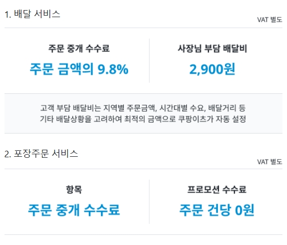 배달서비스는 결제수수료(주문금액의3%/VAT별도)가 별도이고, 고객부담 배달비는 사장님 매출에 포함되지 않습니다. 프로모션과 기타추가혜택의 경우, 적용기준과 내용 및 기간 등은 별도의 고지없이 회사 상황에 따라 유동적으로 운영됩니다.