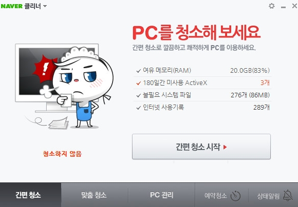네이버 클리너의 PC상태 알리미 기능을 On으로 설정해 놓으면 PC의 변화를 실시간으로 감지하기에, 본인도 모르게 설치되는 프로그램이나 ActiveX 설치 등을 차단할 수 있습니다.