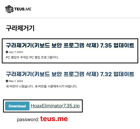 공식 홈페이지(TEUS.me - TEUS.me)에 접속하셔서 좌측에 있는 카테고리들 중 [IT] 카테고리의 [구라제거기] 항목을 선택하시면 최신버전의 소프트웨어를 확인하고 다운로드 할 수 있습니다. 현재날짜를 기준으로 가장 최신버전은 7.35이며, 압축파일 형태로 제공되고 있습니다.