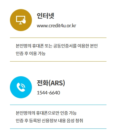 만약, 본인명의 휴대폰 및 공동인증서가 없는 경우에는 본인신용정보조회를 할 수 없으므로 우편조회나 방문조회를 이용하시기 바랍니다.
