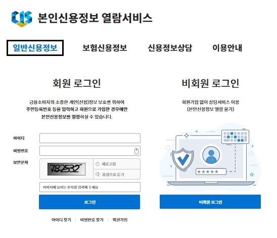 개인정보가 포함된 내용이기에 금융소비자의 소중한 개인(신용)정보 보호를 위하여 주민등록번호 등을 입력하고 회원으로 가입한 경우에만 열람이 가능합니다. 비회원으로 로그인하여 상담서비스를 이용할 수 있지만, 본인신용정보 열람은 불가합니다.