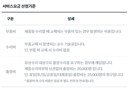 출장비 : 유상수리 대상으로 출장수리를 요구하는 경우에 해당되며, 제품수리 여부와 관계없이 20,000원(휴일 25,000원) 청구. 출장비 외 수리비용은 점검 후 별도산정 및 안내