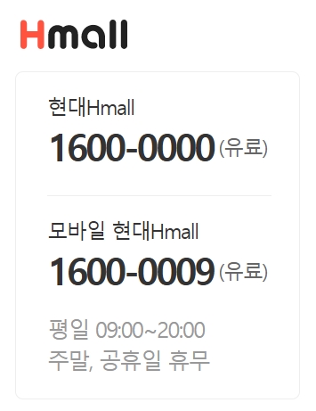 먼저 고객센터 전화번호는 현대Hmall 1600-0000번 및 모바일 현대Hmall 1600-0009번이고, 이용시 통화료가 발생할 수 있습니다. 이용가능 시간은 평일 09시부터 20시까지이고, 주말과 공휴일은 휴무입니다.