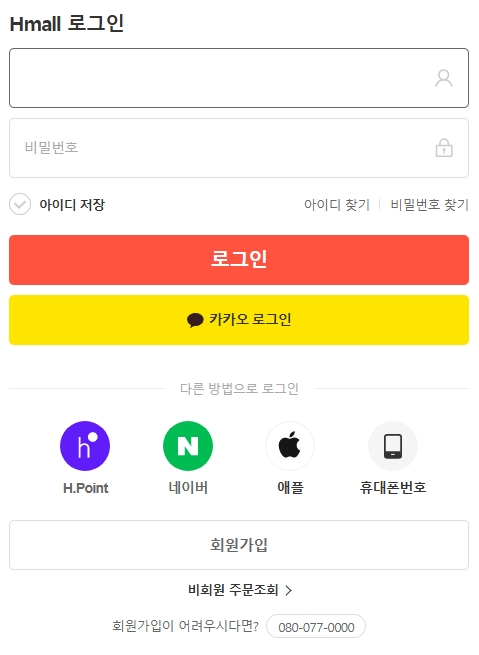 로그인은 아이디 또는 이메일 그리고 비밀번호 입력으로 하실 수 있습니다. H.Point, 네이버, 카카오, 애플, 휴대폰번호를 활용한 로그인도 가능하니 참고하세요.