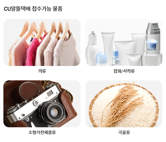 CU 알뜰택배 접수가능 물품은 의류, 잡화/서적류, 소형가전제품류, 곡물류이고 이미지 예시는 아래 그림을 참고하세요.