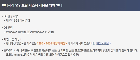 현대해상 영업포탈 시스템 사용을 위한 권장사양은 다음과 같습니다.