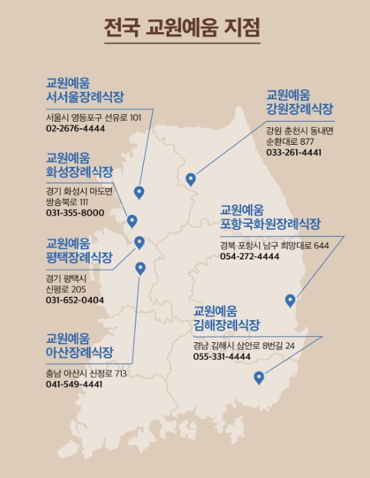 전국의 교원예움 지점은 서서울, 화성, 평택, 아산, 강원, 포항국화원, 김해 장례식장으로 총 7곳이 있으며 각 지점의 주소와 연락처 정보는 위의 그림을 참고하시기 바랍니다.