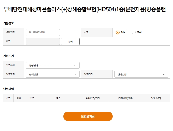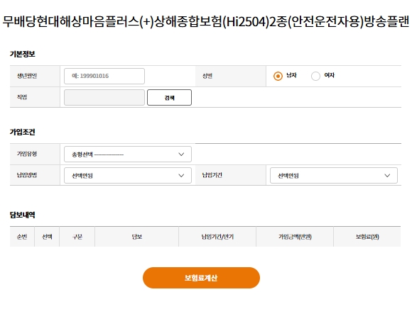 무배당 현대해상 마음플러스(+) 상해종합보험(Hi2504) 2종(안전운전자용) 방송플랜 상품입니다. 기본정보와 가입정보를 입력하고, 담보내역 확인 후 원하는 담보를 추가하여 보험료를 계산할 수 있습니다.