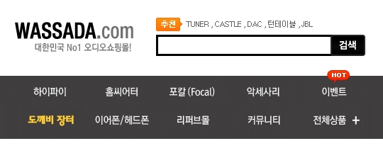 홈페이지(와싸다닷컴)에 접속하시면 위의 그림처럼 하이파이, 홈씨어터, 포칼, 악세사리, 이벤트, 도깨비장터, 이어폰/헤드폰, 리퍼브몰, 커뮤니티 카테고리를 열람하실 수 있어요.