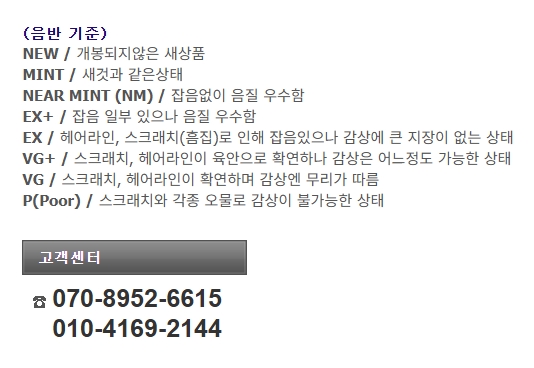 음반 상태에 따른 기준 그리고 고객센터 전화번호에 대해서는 위의 그림을 참고하세요. 음반 등급은 통용화되지 않은 지극히 주관적인 견해로 매겨진 것이기에, 필수적으로 청음과 이미지의 상태를 면밀히 검토한 후 구매여부를 결정하시기 바랍니다.